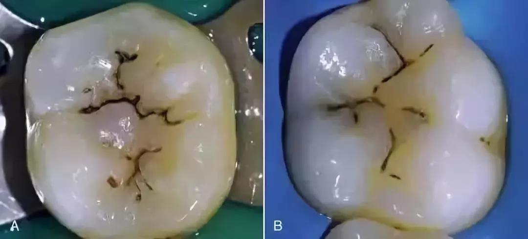 我们常说的后牙,学名第一磨牙和第二磨牙,是磨碎食物的主要牙齿,也是最坚硬,最大的牙齿。首先我们需要了解后牙窝沟点隙的结构,即发育沟。后牙的表面即咬合面,一般会有四个隆起角,由牙胚发育而成。四个隆起部位之间形成沟壑点隙。这些沟壑的形态不同,而这些沟壑最容易附着堆积污垢细菌,形成窝沟龋,窝沟龋形态千变万化,每个人的样子都不同,但大致都会有明显的黑线模样。