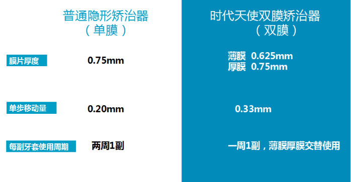 隐形矫正,是通过透明牙套对牙齿施加矫治力,从而达到矫正牙齿的效果,每个矫治阶段更换一副牙套,两周一个矫治阶段。而时代天使的“双膜”矫正器,则是在每个矫治阶段都需要使用到薄膜、厚膜两副牙套,即每周更换一副,薄膜、厚膜交替使用。一般隐形矫正一个阶段让牙齿位移0.2mm,而在薄膜与厚膜的双重作用下,为牙齿提供轻柔而持续的矫治力,相同时间却能产生0.33mm的位移,从而达到快速、精准、舒适的矫正效果。