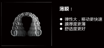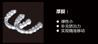 精准:薄膜虽然能加快矫治速度,但却有可能导致牙根未稳定而反弹,这时候,交替使用弹性较小的厚膜,就能为牙根部分补充矫治力,稳固牙齿的位移,实现牙齿的精准移动。