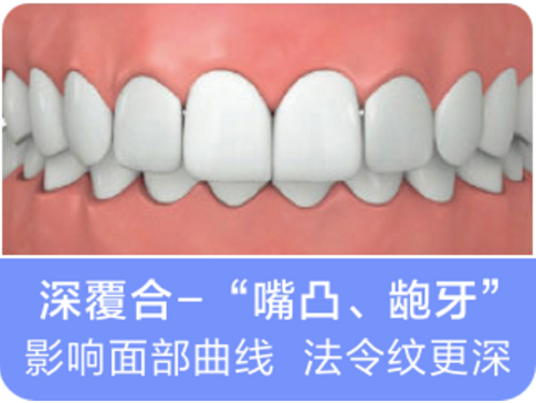 深覆盖、深覆合的现象在中国人中算是相当常见的,除了影响面部曲线,加深法令纹,还会导致牙龈问题或溃疡,下颌牙齿磨损,并引起颞下颌关节疼痛。牙齿前凸通常由遗传基因、不良的口腔习惯、或支撑牙齿的骨骼过度发育引起。