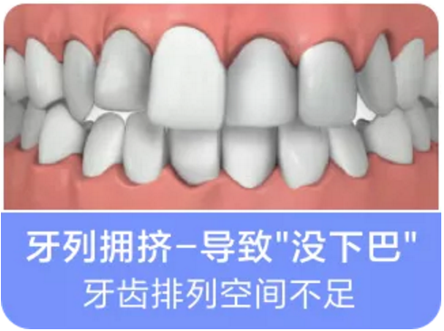 牙弓内因缺少空间而无法正常容纳所有牙齿,表现为牙齿因间隙不足而排列错乱,并因此影响到牙弓形态与咬合关系。重度牙齿拥挤,不仅影响口腔清洁,更易引发口腔各种疾病,继而影响牙齿正常发育,导致下巴发育不足,形成“没下巴”。