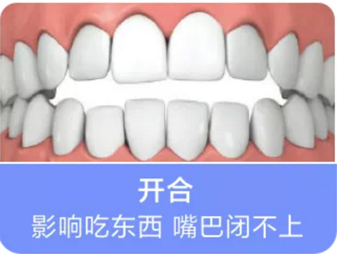 口腔不良习惯如吐舌、舔牙、伸舌、吸手指等,是常见引起牙齿开合的原因。因前牙咬不到一起,非常影响前牙咀嚼,常伴有肠胃及呼吸道问题。矫正后,牙齿咀嚼功能改善,肠胃及因开合引起的呼吸道问题,都可以得到解决。