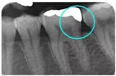 从下面这张X线中可以看出,嵌体远中边缘没有悬突,与牙体边缘密合相接。