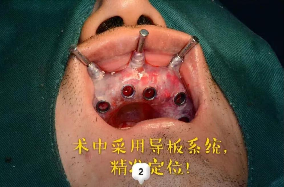 第一次耗时两个多小时:先进行了术前的测量评估,指定手术方案;术中采用数字化种牙导板,精准定位;逐级备洞,植入植体,扭力复合完成植入上半口。