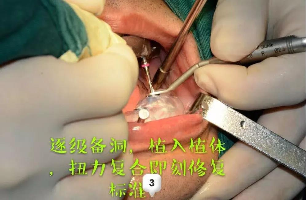 第一次耗时两个多小时:先进行了术前的测量评估,指定手术方案;术中采用数字化种牙导板,精准定位;逐级备洞,植入植体,扭力复合完成植入上半口。