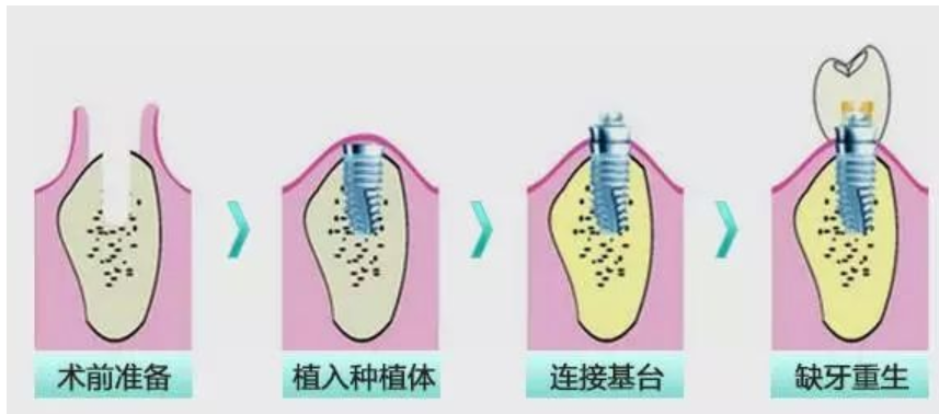 种植牙是在牙槽骨中植入人工牙根(通常为生物相容性极好的纯钛金属),然后镶上基座,最后装上新牙冠。因其不用磨小相邻两颗牙齿,种上的牙齿不但和原来的一样好用,而且一般不用再更换,被医学界称为缺失牙较好修复方式,“人类的第三副牙齿”。