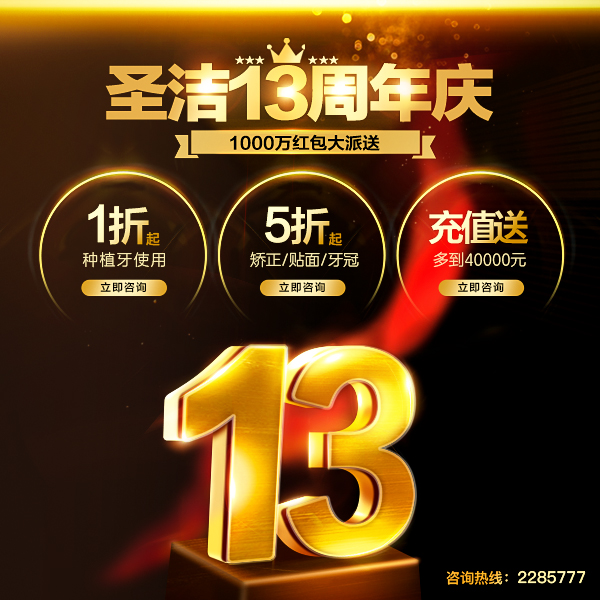 【温馨提示】精于种植,专业美齿。廊坊圣洁口腔医院连锁13周年感恩庆典活动正在进行中,如果您还有其他需要可点击在线咨询或是拨打爱牙热线:0316—2285777,进行预约!