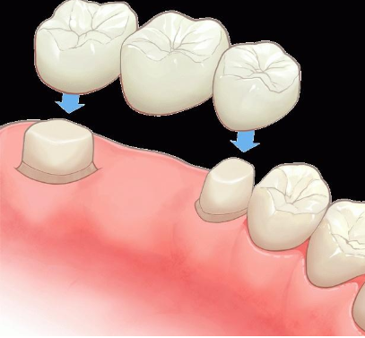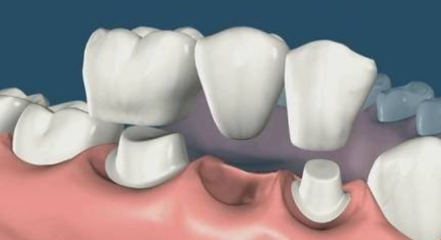 缺牙镶三的烤瓷冠:在上面提到了。牙齿缺失了,单做一颗是无法固定上去的,所以要用旁边的邻牙作为支撑,做搭桥。